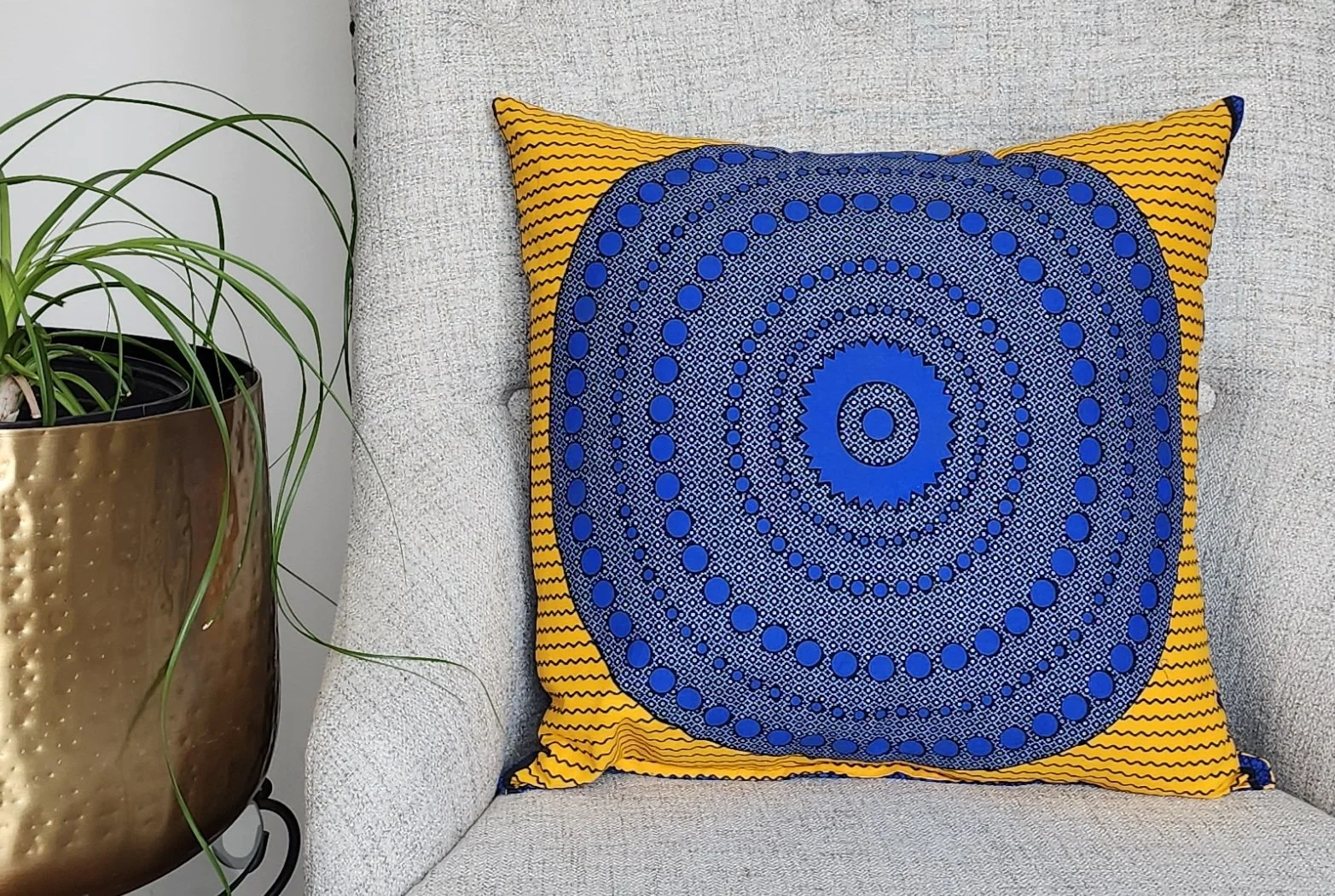 A decorative pillow made with African print fabric is lively, meaningful, and handcrafted. A blend of tradition with contemporary home décor enhances your space. An accent piece that is uniquely designed, bold and eye-catching!