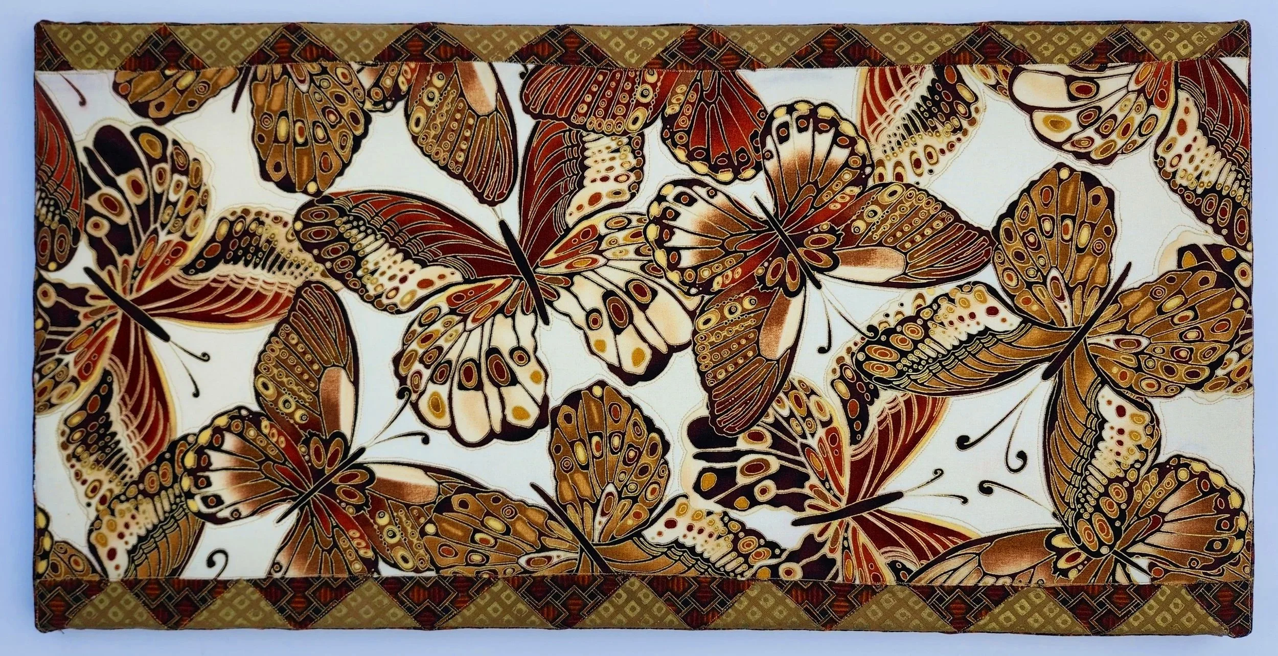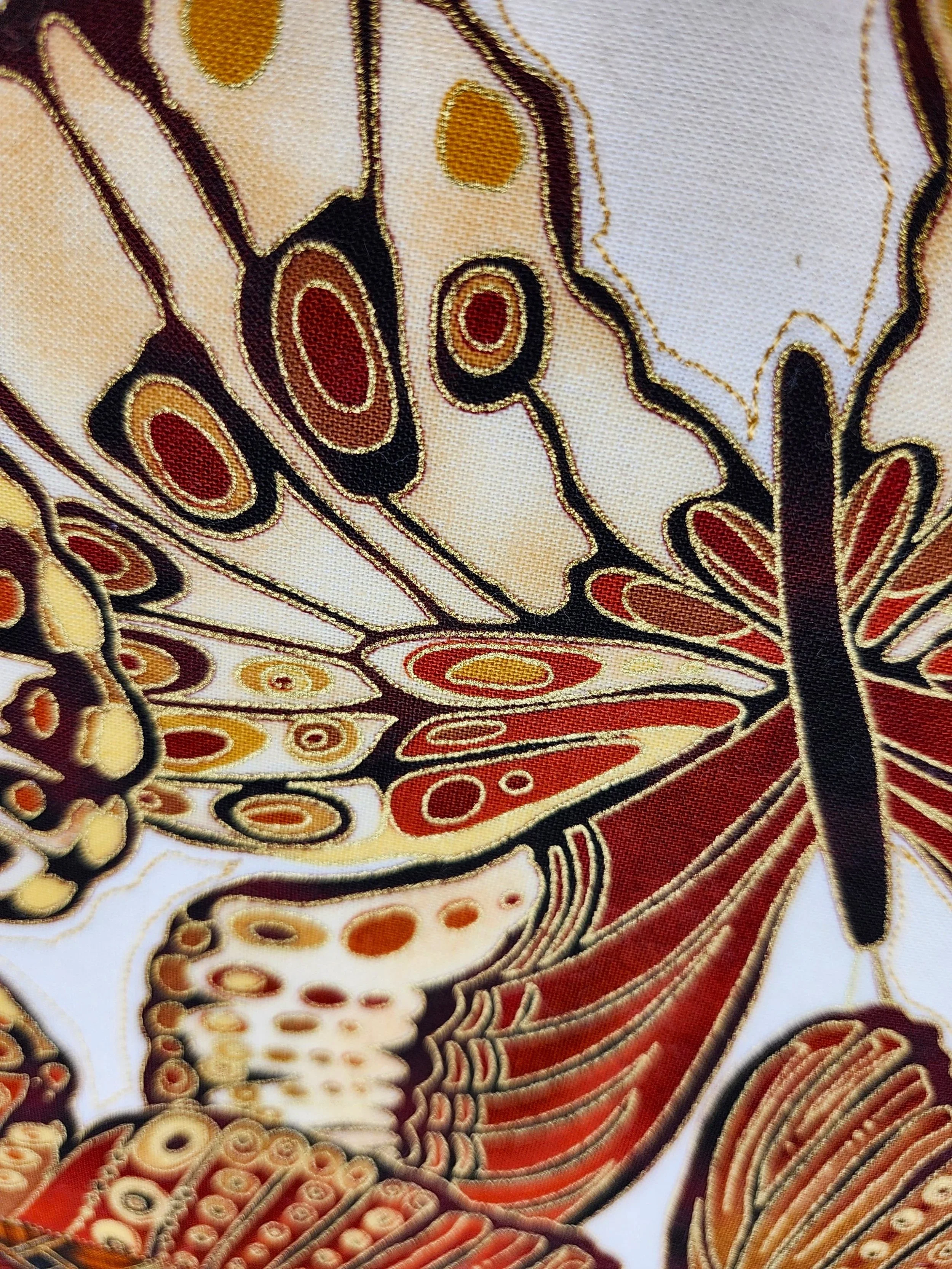 Butterfly Magic - a golden flutter captures the enchanting beauty of butterflies in motion—magically fluttering their large, delicate wings across a richly textured quilted canvas. Warm, earthy tones of brown, rust, and off-white are gracefully illuminated with shimmering gold metallic accents, giving the piece a sense of movement and quiet radiance.
