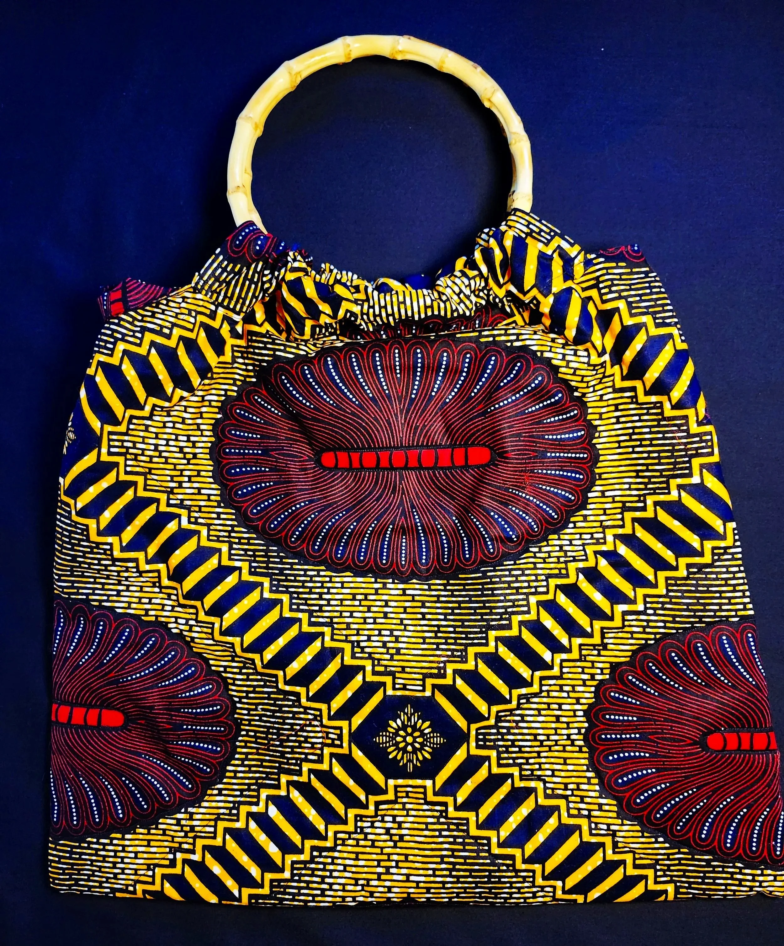 Materials: 100% cotton exterior, fed satin lining, 8-inch wooden circular bamboo style handles