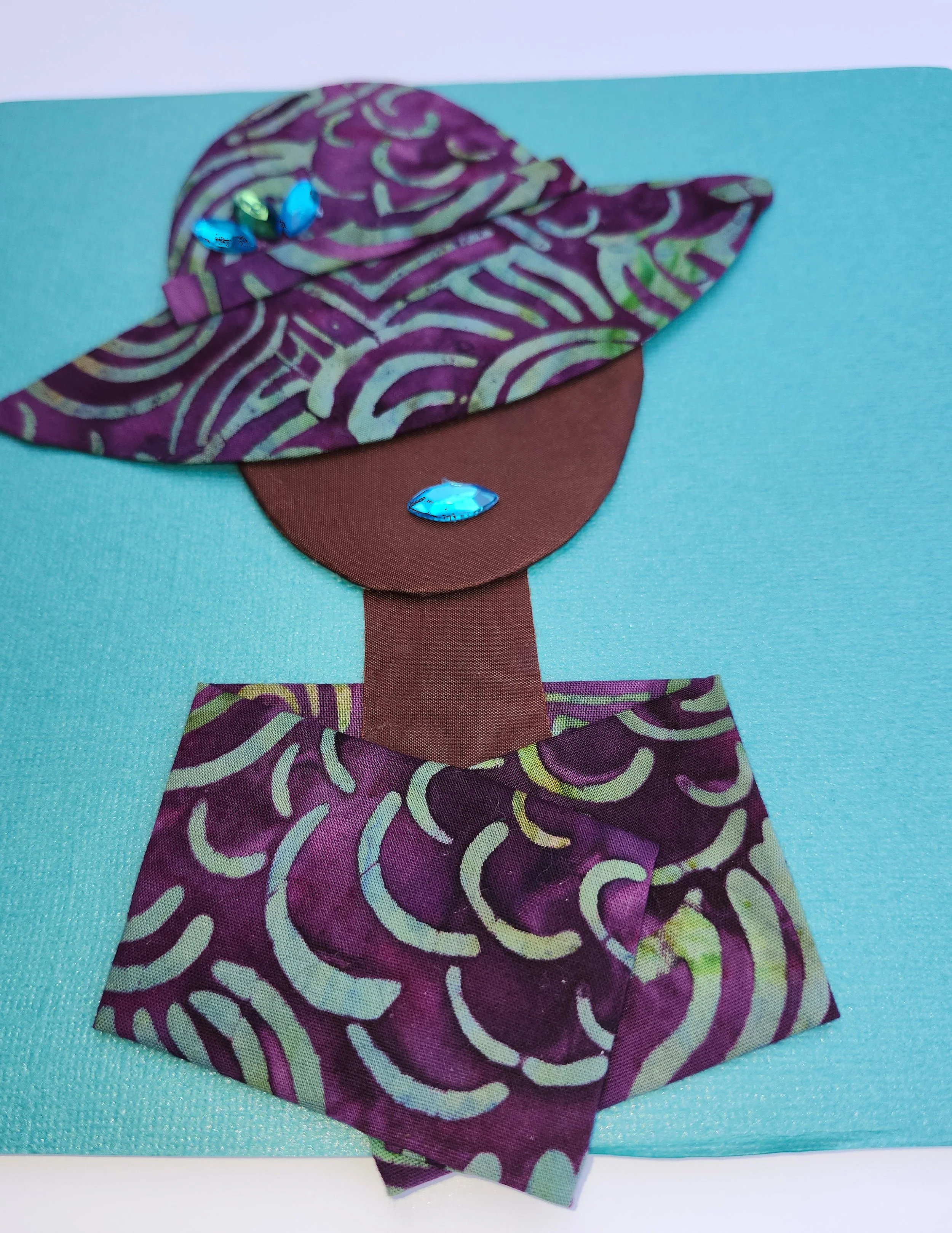 A graceful and stylish lady with a rich brown satin skin tone radiates confidence and cultural elegance in this striking portrait. She is draped in flowing batik fabric of purple and green—an homage to heritage and artistic tradition. Her ensemble is crowned with a beautifully structured hat, adorned with shimmering blue rhinestones that add a perfect touch of sophistication and sparkle.