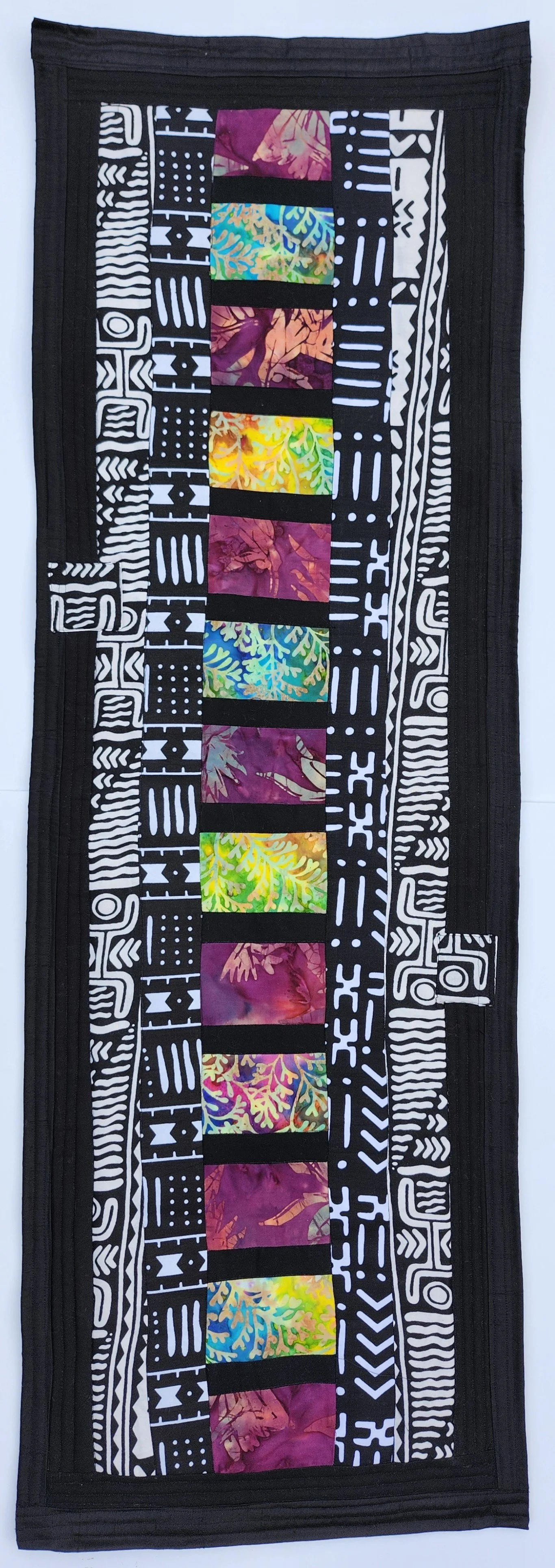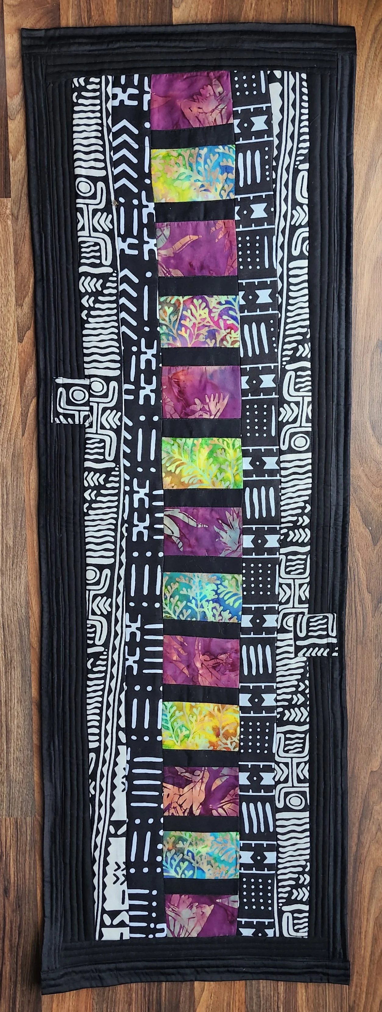 Add a vibrant, artistic touch to your space with the Pathways quilt art contemporary table runner. Crafted with vivid batik fabrics and accented by a striking black and white contemporary design, this one-of-a-kind piece brings color, movement, and modern flair to any setting.