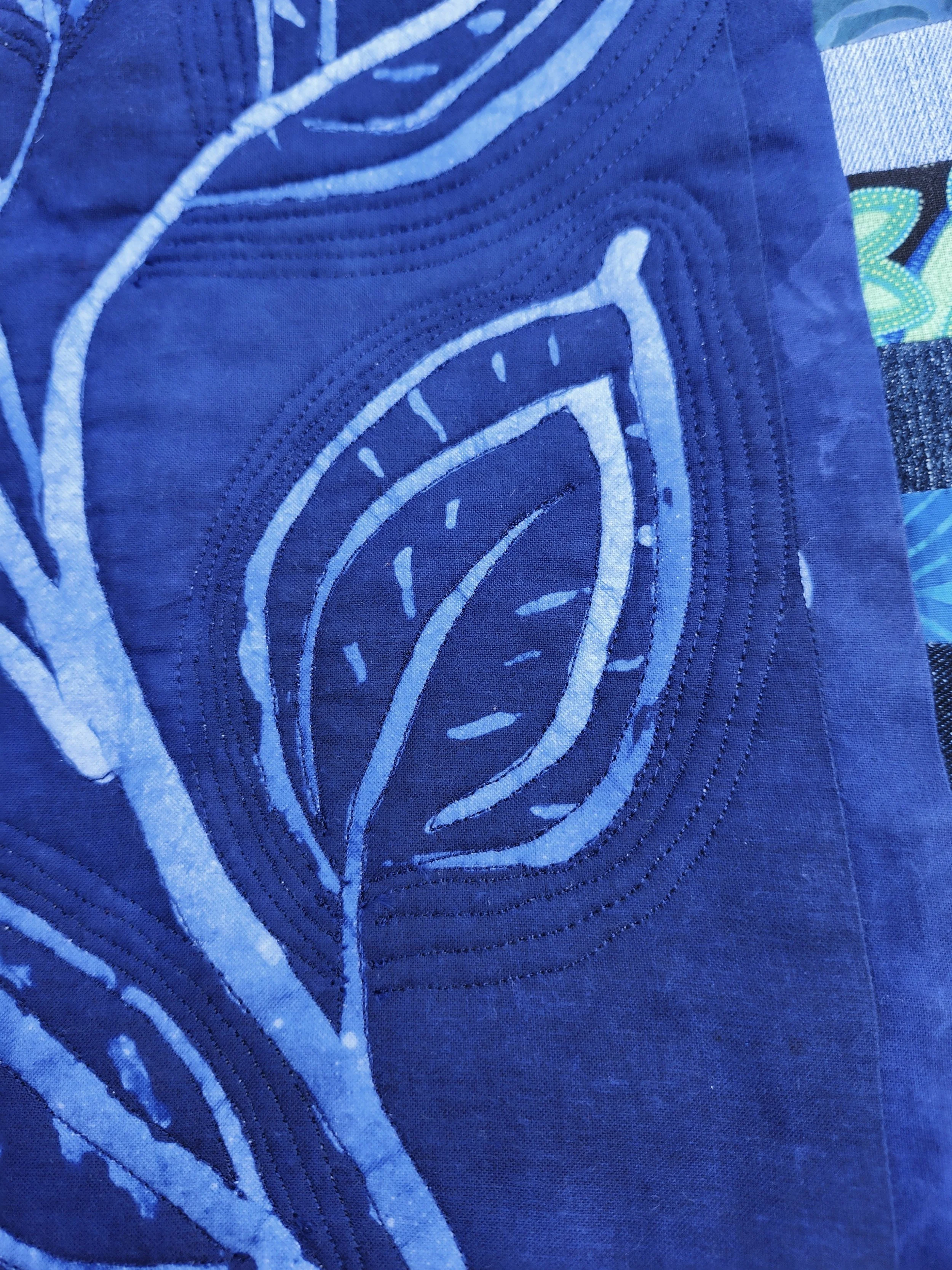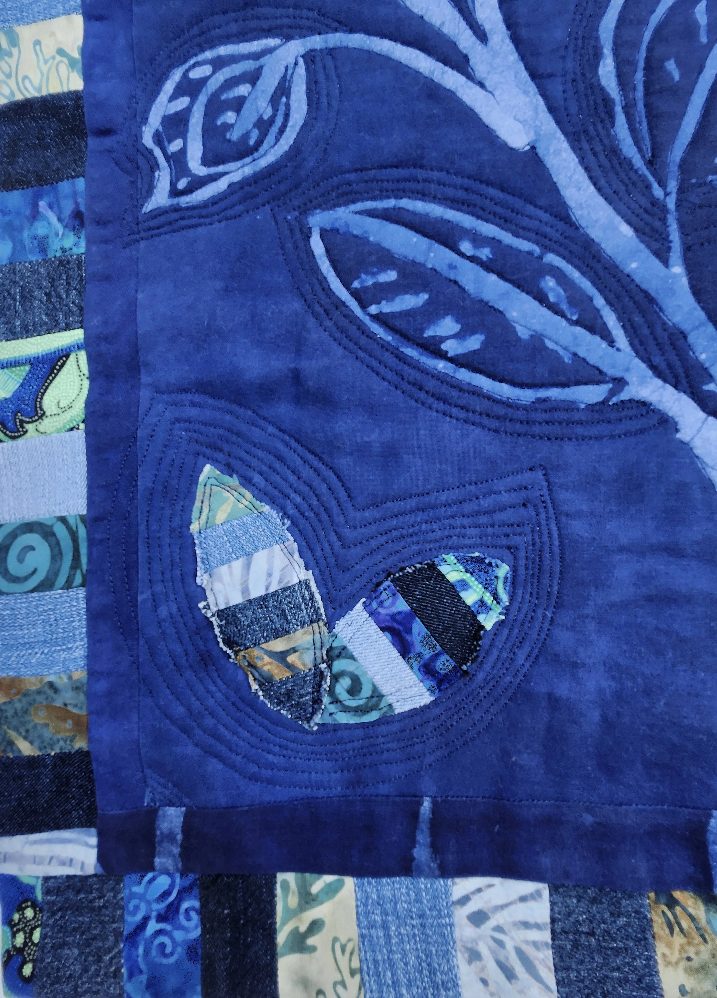 At its heart, a hand-drawn leaf design winds gracefully across the surface, representing the cycle of letting go and regrowth. The piece is beautifully accented in the lower corner and along the border with a vibrant mix of commercially printed batik fabrics, bold paisley patterns, and repurposed denim in varying shades of blue. Each element adds texture and meaning—layering past and present, purpose and renewal. This artwork is a celebration of resilience—of being pruned not to diminish, but to thrive.