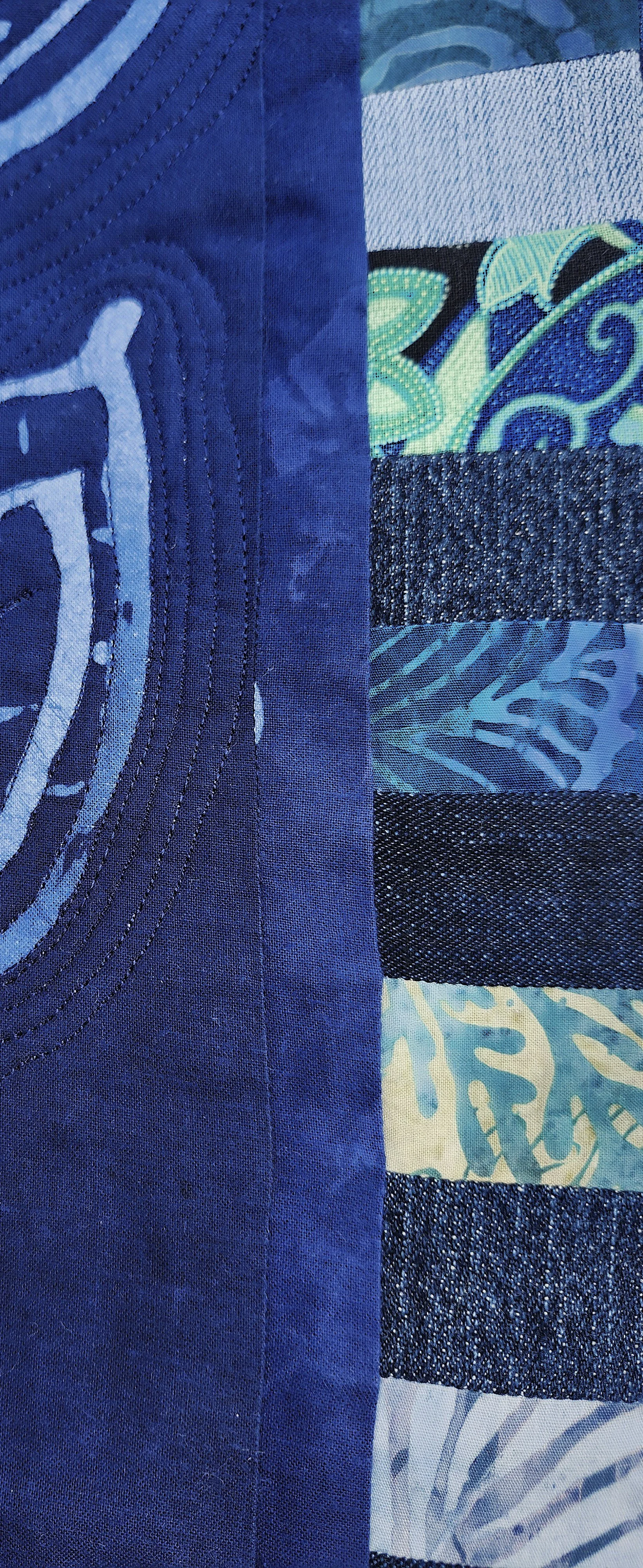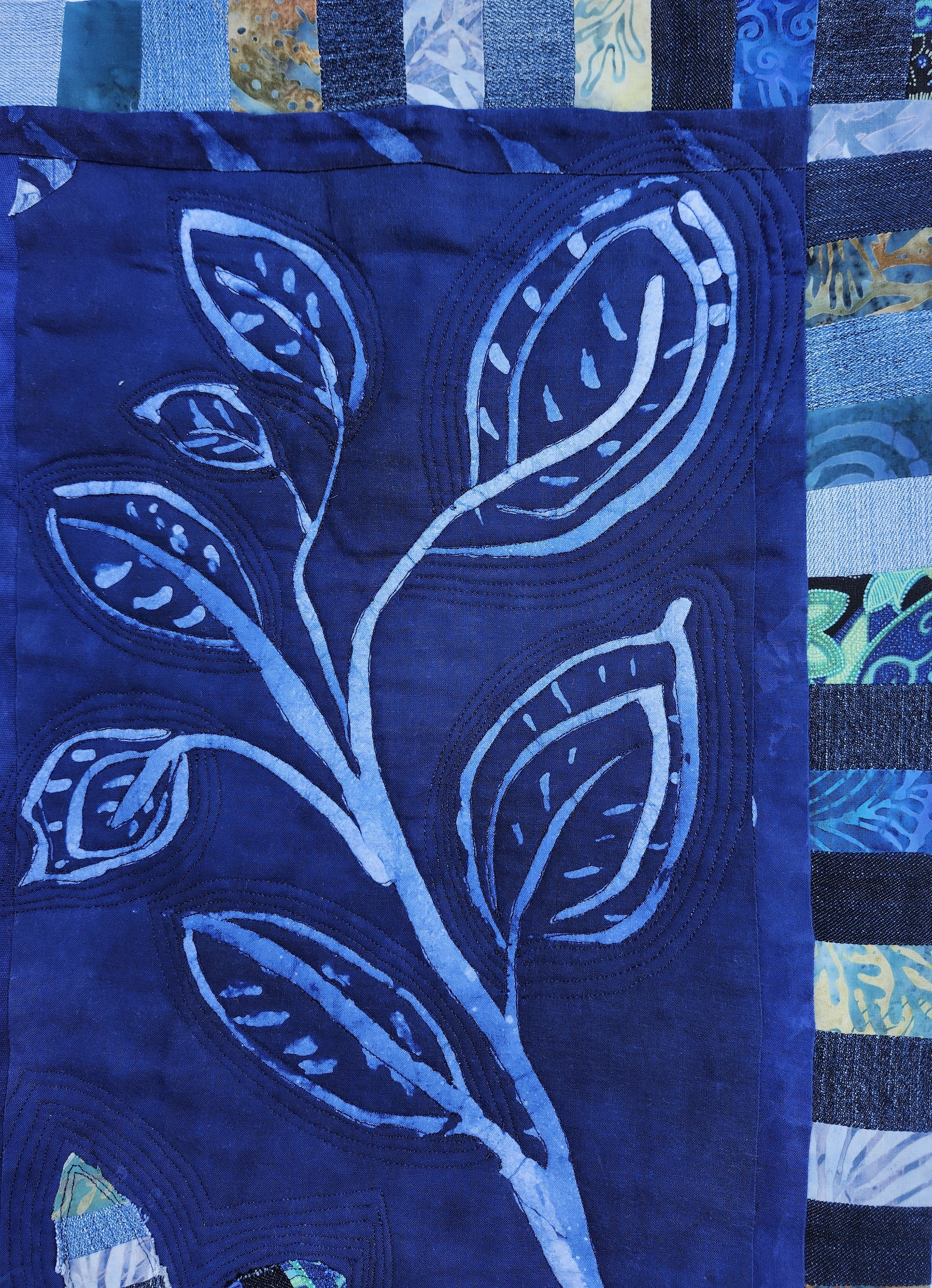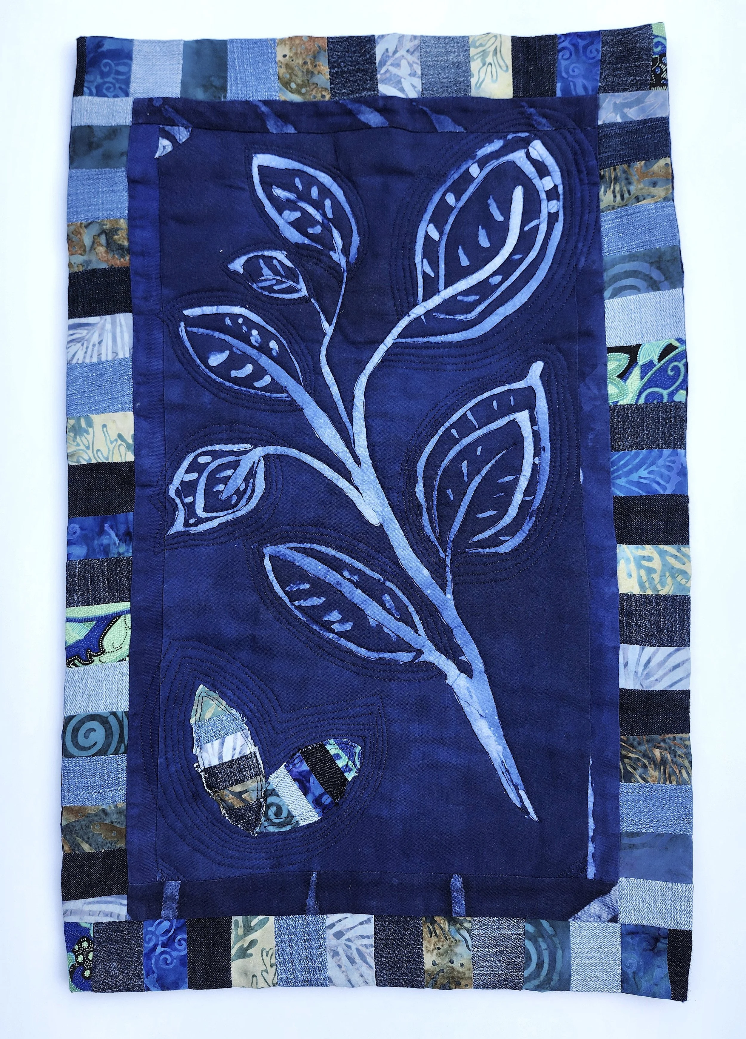 Medium: Hand-dyed Batik on 100% cotton repurposed denim. Instructions for cleaning and displaying quilt art are included with purchase.